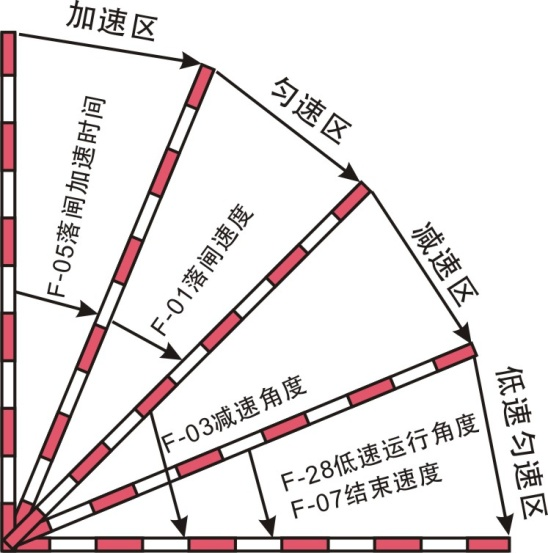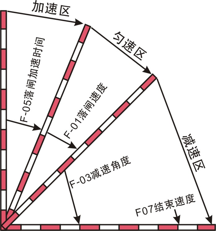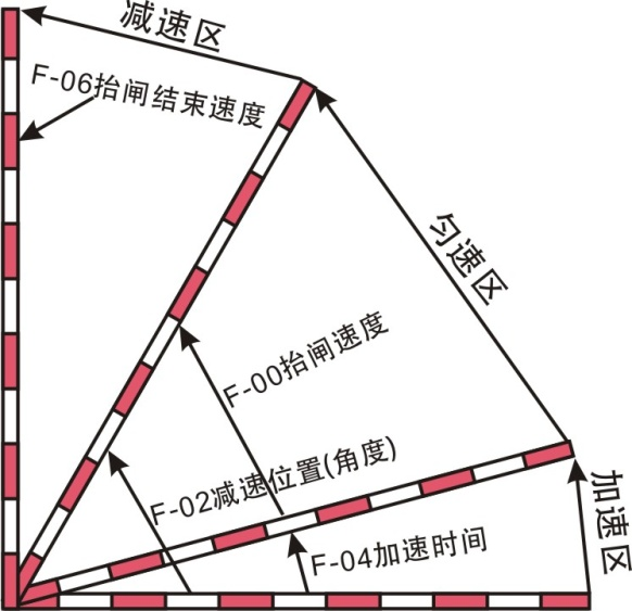 范圍:45-100,默認(rèn):90,大于等于90度或者小于等于F-02抬閘減速角度則無(wú)效。在抬閘的過(guò)程中設(shè)置了一個(gè)低速區(qū)域,當(dāng)抬閘角度達(dá)到設(shè)定的角度,則以F-06抬閘結(jié)束速度運(yùn)行,知道抬閘到位。