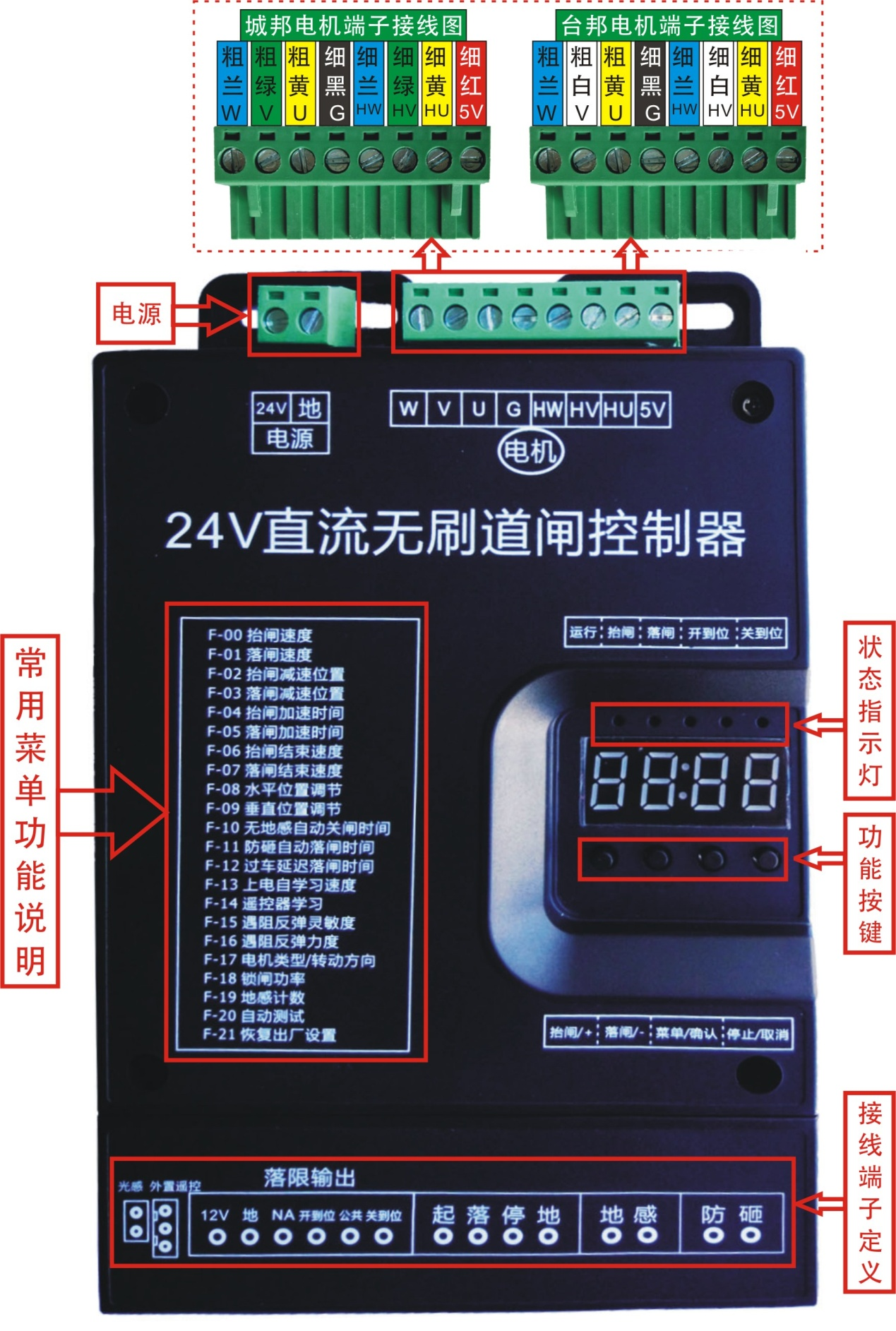 控制器有4個(gè)按鍵,從左往右分別是“抬閘/+”、 “落閘/-”、 “菜單/確認(rèn)”“停止/取消”,可以通過(guò)這4個(gè)鍵對(duì)控制器的各種參數(shù)進(jìn)行設(shè)置。