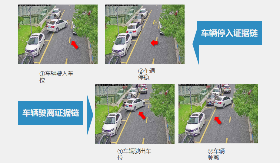 相機在車輛停入/駛離車位過程中,將分別抓拍過程圖,組成停車證據(jù)鏈。